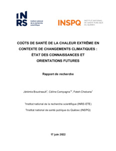 Ce rapport de recherche constitue une première étape d’un projet de doctorat sur mesure en science des données et en santé environnementale effectué au Centre Eau Terre Environnement (ETE) de l’Institut national de la recherche scientifique (INRS) en collaboration avec l’Institut national de santé publique du Québec (INSPQ). Il vise à faire l’état des lieux sur les coûts de santé associés à la chaleur extrême dans un contexte de changements climatiques et des approches de la science des données pouvant être mises à contribution pour ce faire. D’abord, le contexte général sera décrit. Puis, une revue de littérature sera présentée, se déclinant en trois sections. La première section abordera la modélisation des relations chaleur extrême-santé, étant donné que de nombreuses analyses sur les coûts de santé reposent sur des études épidémiologiques a priori du lien entre la chaleur extrême et la mortalité ou la morbidité. La seconde section s’intéressera en détail à l’estimation des coûts de santé associés à la chaleur extrême. Finalement, la troisième section touchera la projection des impacts sanitaires et économiques de la chaleur extrême en fonctions de diverses hypothèses futures, comme les changements climatiques, démographiques et socioéconomiques. Après la présentation de la revue de la littérature, la problématique sera décrite ainsi que les objectifs poursuivis dans ce projet de recherche. La méthodologie proposée sera présentée en fonction des connaissances actuelles, des problématiques soulevées, des objectifs fixés ainsi que des données disponibles. Ce projet de recherche ne serait pas pertinent s’il n’avait pas quelconques contributions à apporter, tant sur le plan de la recherche que sociétal. Ces apports seront donc présentés en guise de conclusion, avec un calendrier de réalisation des étapes subséquentes.