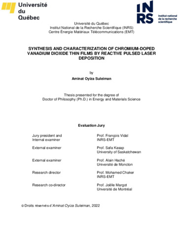 Suleiman, Aminat Oyiza (2022). Synthesis and characterization of chromium-doped vanadium dioxide thin films by reactive pulsed laser deposition. Thèse. Québec, Doctorat en sciences de l'énergie et des matériaux, Université du Québec, Institut national de la recherche scientifique, 167 p.