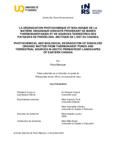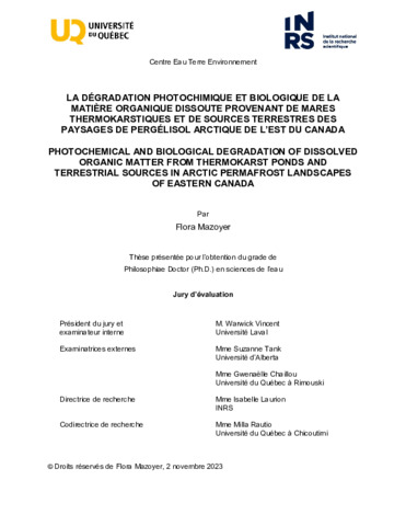 Mazoyer, Flora (2023). La dégradation photochimique et biologique de la matière organique dissoute provenant de mares thermokarstiques et de sources terrestres des paysages de pergélisol arctique de l’est du Canada / Photochemical and biological degradation of dissolved organic matter from thermokarst ponds and terrestrial sources in arctic permafrost landscapes of eastern Canada. Thèse. Québec, Doctorat en sciences de l'eau, Université du Québec, Institut national de la recherche scientifique, 238 p.