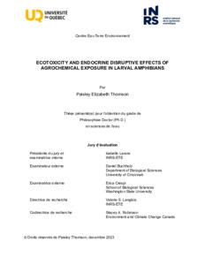 Thomson, Paisley Elizabeth (2023). Ecotoxicity and endocrine disruptive effects of agrochemical exposure in larval amphibians. Thèse. Québec, Doctorat en sciences de l'eau, Université du Québec, Institut national de la recherche scientifique, 240 p.