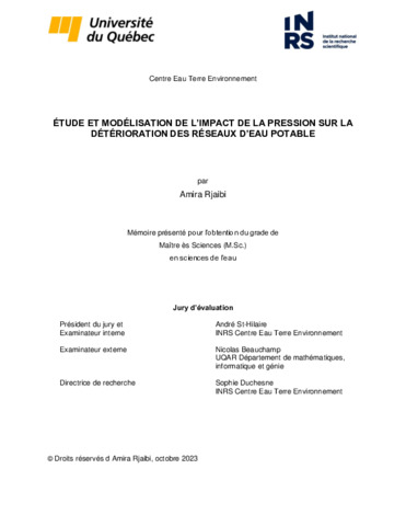 Rjaibi, Amira (2023). Étude et modélisation de l’impact de la pression sur la détérioration des réseaux d’eau potable. Mémoire. Québec, Maîtrise en sciences de l'eau, Université du Québec, Institut national de la recherche scientifique, 82 p.