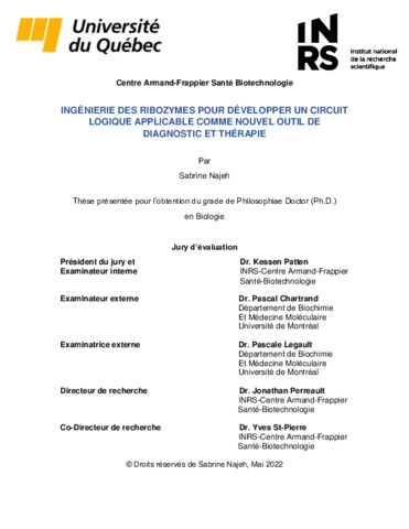 Najeh, Sabrine (2022). Ingénierie des ribozymes pour développer un circuit logique applicable comme nouvel outil de diagnostic et thérapie Thèse. Québec, Université du Québec, Institut national de la recherche scientifique, Doctorat en biologie, 290 p.