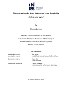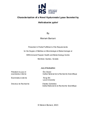 Beniani, Meriem (2023). Characterization of a Novel Hyaluronate Lyase Secreted by Helicobacter pylori Mémoire. Québec, Université du Québec . Institut national de la recherche scientifique, Maîtrise en microbiologie appliquée, 67 p.