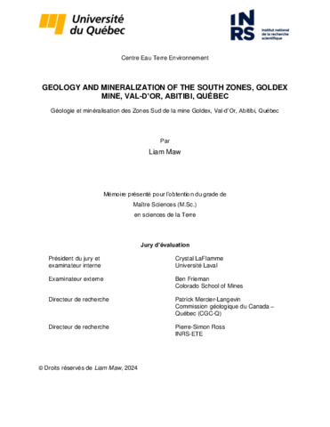 Maw, Liam (2024). Geology and mineralization of the south zones, Goldex Mine, Val-D'or, Abitibi, Québec Mémoire. Québec, Université du Québec, Institut national de la recherche scientifique, Maîtrise en sciences de la terre, 152 p.