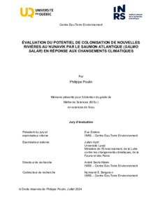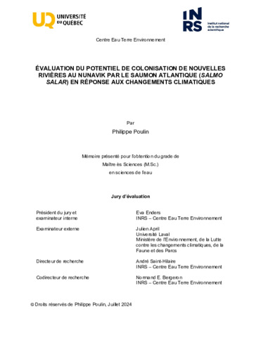 Poulin, Philippe (2024). Évaluation du potentiel de colonisation de nouvelles rivières du Nunavik par le saumon atlantique (Salmo Salar) en réponse aux changements climatiques. Mémoire. Québec, Université du Québec, Institut national de la recherche scientifique, Maîtrise en sciences de l'eau, 83 p.