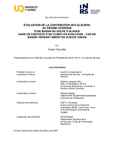 Doumbia, Cheick (2024). Évaluation de la contribution des glaciers au régime hydrique d’un bassin du golfe d’Alaska dans un contexte d’un climat en évolution – cas du bassin versant amont du fleuve Yukon Thèse. Québec, Université du Québec, Institut national de la recherche scientifique, Doctorat en sciences de l'eau, 224 p.