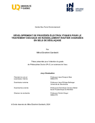Ebrahimi Gardeshi, Mitra (2024). Développement de procédés électrolytiques pour le traitement des eaux de ruissellement routier chargées en sels de déglaçage Thèse. Québec, Université du Québec, Institut national de la recherche scientifique, Doctorat en sciences de l'eau, 181 p.