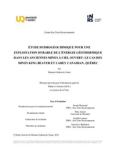 Goldoni De Souza, Mariana (2024). Étude hydrogéochimique pour une exploitation durable de l'énergie géothermique dans les anciennes mines à ciel ouvert: le cas des mines King Beaver et Carey Canadian, Québec Mémoire. Québec, Université du Québec, Institut national de la recherche scientifique, Maîtrise en sciences de la Terre, 100 p.