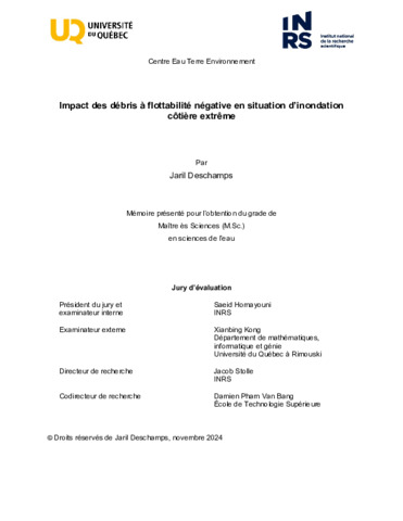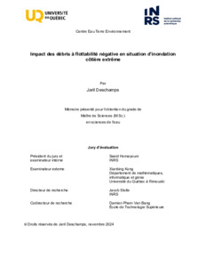 Deschamps, Jaril (2024). Impact des débris à flottabilité négative en situation d’inondation côtière extrême Mémoire. Québec, Université du Québec, Institut national de la recherche scientifique, Maîtrise en sciences de l'eau, 68 p.