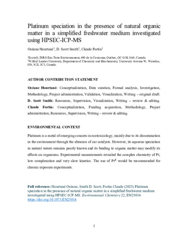 Platinum speciation in the presence of natural organic matter in a simplified freshwater medium investigated using HPSEC-ICP-MS.