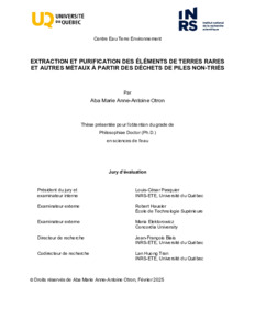 Otron, Aba Marie Anne-Antoine (2025). Extraction et purification des éléments de terres rares et autres métaux à partir des déchets de piles non triés. Thèse. Québec, Université du Québec, Institut national de la recherche scientifique, Doctorat en sciences de l'eau, 262 p.