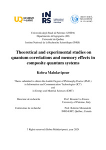 Mahdavipour, Kobra (2024). Theoretical and experimental studies on quantum correlations and memory effects in composite quantum systems. Thèse. Italie, Québec, Università degli Studi di Palermo / Université du Québec, Institut national de la recherche scientifique, Doctorat en technologies des communications et en sciences de l'énergie et des matériaux, 114 p.