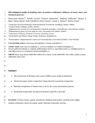 Microbiological quality of drinking water in northern settlements: Influence of source water and treatment processes.