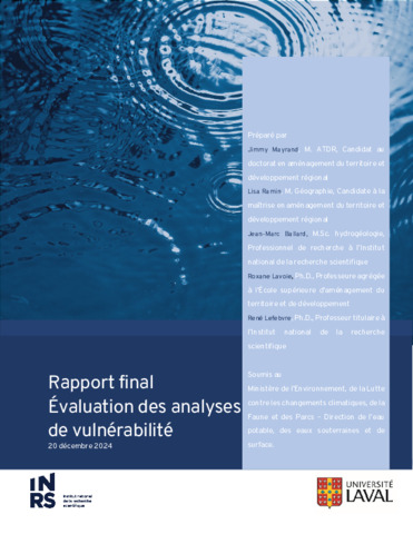 Le Règlement sur le prélèvement des eaux et leur protection (Q-2, r. 35.2 RPEP ; entré en vigueur le 14 août 2014) exigea que toutes les municipalités québécoises qui alimentent en eau plus de 500 personnes devaient produire, pour le 1er avril 2021, un rapport d’analyse de vulnérabilité (RAV) de leur source d’eau potable. Les RAV visent principalement à délimiter les aires de protection des prélèvements d’eau potable ainsi qu’à répertorier et à caractériser les menaces potentielles à la qualité et à la quantité de l’eau prélevée. L’information contenue dans l’ensemble des RAV représente ainsi une « nouvelle » source de données sur l’eau potable au Québec. C’est dans ce contexte que le MELCCFP a octroyé le mandat à l’Université Laval et à l’INRS d’analyser le contenu des RAV pour en faire une synthèse. Le présent rapport documente cette synthèse dans le but d’améliorer les futures analyses lors de leur révision quinquennale et d’évaluer les besoins d’accompagnement des municipalités lors de l’élaboration des plans de protection des sources d’eau potable basés sur les RAV. La première partie de ce rapport présente le contexte et la portée du mandat, les objectifs, les limites dans les analyses et le contenu d’un RAV. La section 2 expose la synthèse du contenu des analyses de vulnérabilité, dont les principaux éléments ont été saisis et intégrés à une base de données. Cette synthèse brosse un portrait des sources municipales d’approvisionnement en eau potable en termes de nombres, de caractéristiques et de prélèvements. Une évaluation critique de l’analyse hydrogéologique des aires de protection des sites de prélèvement a permis d’apprécier la qualité de la documentation, les méthodes utilisées pour délimiter les aires de protection et la validité des aires délimitées. La section 3 présente une évaluation de la qualité des rapports sous la forme d’un tableau détaillé, accompagné d’exemples, proposant une structure et un contenu systématique pour les futurs RAV. Les sections 4, 5 et 6 présentent le retour d’expérience des acteurs clés, soit les municipalités, les firmes mandatées pour réaliser les analyses, les organismes de bassin versant et les groupes de recherche universitaire qui ont réalisé des analyses de vulnérabilité. La section 7 porte sur l’étude des perceptions du public par rapport aux analyses de vulnérabilité. Elle a été réalisée grâce à une revue de presse et à une recherche documentaire sur les I publications faites entre 2015 et 2022. Le but de la revue de presse était d’identifier les prises de position du public et les actions menées par les institutions à la suite de la réalisation des RAV. Enfin, dans la section 8, des constats et des recommandations sont émis afin d’améliorer la démarche de réalisation des analyses de vulnérabilité et de supporter l’élaboration des plans de protection des sources d’eau potable. Au total, 18 constats ont été établis par les intervenants du milieu (réalisateurs d’analyse de vulnérabilité) et par l’équipe de recherche. Ces constats ont guidé la formulation de 19 recommandations. Les constats et les recommandations touchent les quatre axes du mandat, soit la synthèse du contenu des rapports d’analyse de vulnérabilité, l’étude de la qualité des rapports pour la production des plans de protection, le retour d’expérience des acteurs et la perception du public.