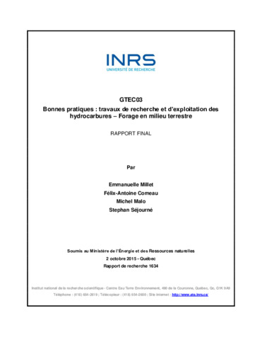 Le présent rapport recense les bonnes pratiques en vue de revoir l’encadrement législatif et réglementaire pour les travaux de forage, de complétion (avec et sans fracturation), de correction, de surveillance, de fermeture et de restauration et remise en état de site. Plus particulièrement, ce sont les travaux suivants qui sont couverts, ceux sur : les distances séparatrices, les sites multipuits, la conception et la construction des puits, les fluides de forage, le système anti éruption et le contrôle de venue des fluides, la tête de puits, les essais de pression et d’étanchéité, les essais aux tiges, les essais d’extraction et de production, les essais d’injectivité, le contrôle de la déviation des puits, les perforations, les stimulations par fracturation, les stimulations autres que par fracturation, la surveillance des fuites et/ou migrations, les mesures correctives, le traitement des hydrocarbures sur le site, les fermetures temporaires de puits, les fermetures définitives de puits, la restauration et la remise en état des sites, et les puits orphelins. Afin d’établir les bonnes pratiques, les lois et règlements des provinces de la Colombie Britannique, de l’Alberta, du Nouveau-Brunswick, des États de New York et du Texas, et de la Grande Bretagne ont été consultées. Les bonnes pratiques élaborées par les entités suivantes ont également être prises en compte dans le cadre du mandat : Canadian Association of Petroleum Producers (CAPP), American Petroleum Institute (API), The Safety Association for Canada’s Upstream Oil and Gas Industry (Enform), Interstate Oil and Gas Compact Commission (IOGCC) et State Oil and Gas Regulatory Exchange (SOGRE).