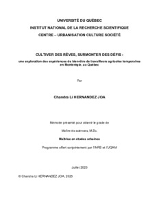 Hernandez Joa, Chandra Li (2025). Cultiver des rêves, surmonter des défis : une exploration des expériences de bien-être de travailleurs agricoles temporaires en Montérégie, au Québec Mémoire. Québec, Université du Québec, Institut national de la recherche scientifique, Maîtrise en études urbaines, 160 p.