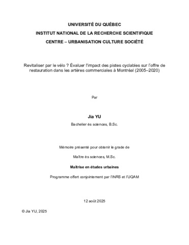 Yu, Jia (2025). Revitaliser par le vélo ? : évaluer l'impact des pistes cyclables sur l’offre de restauration dans les artères commerciales à Montréal (2005–2020) Mémoire. Québec, Université du Québec, Institut national de la recherche scientifique, Maîtrise en études urbaines, 95 p.
