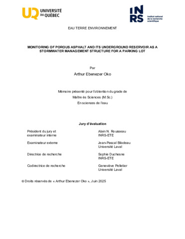 Ebenezer Oko, Arthur (2025). Monitoring of porous asphalt and its underground reservoir as a stormwater management structure for a parking lot Mémoire. Québec, Université du Québec, Institut national de la recherche scientifique, Maîtrise en sciences de l'eau, 120 p.