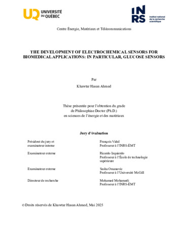 Ahmed, Khawtar Hasan (2025). The development of electrochemical sensors for biomedical applications: in particular, glucose sensors. Thèse. Québec, Université du Québec, Institut national de la recherche scientifique, Doctorat en sciences de l'énergie et des matériaux, 122 p.