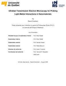 Doostkam, Rasool (2025). Ultrafast transmission electron microscopy for probing light-matter interactions in nanomaterials. Thèse. Québec, Université du Québec, Institut national de la recherche scientifique, Doctorat en sciences de l'énergie et des matériaux, 135 p.